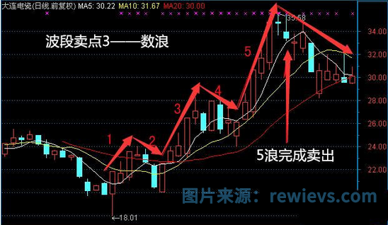 3、波段卖点——数浪,如下图所示,波浪理论一共有5个浪,走完第5浪股价一般就会下跌。